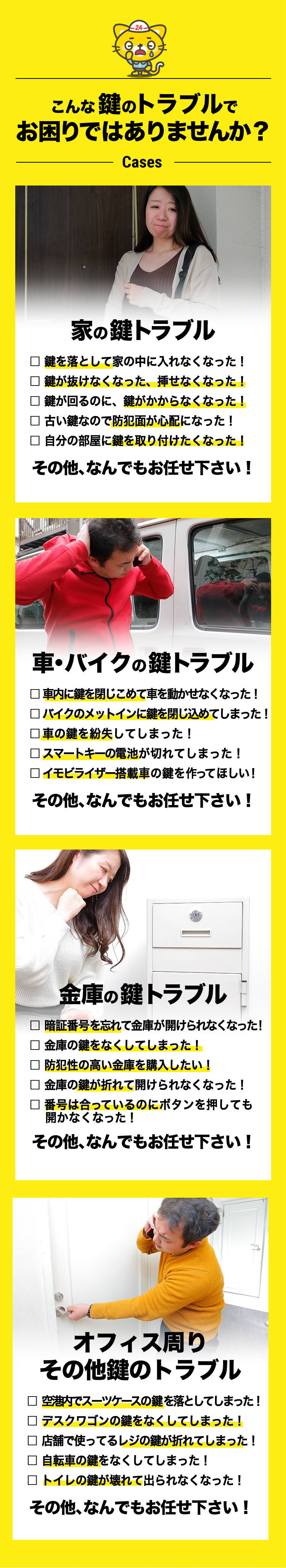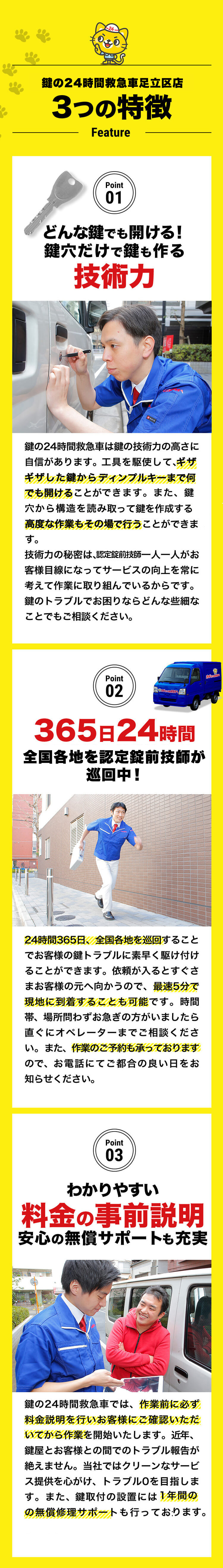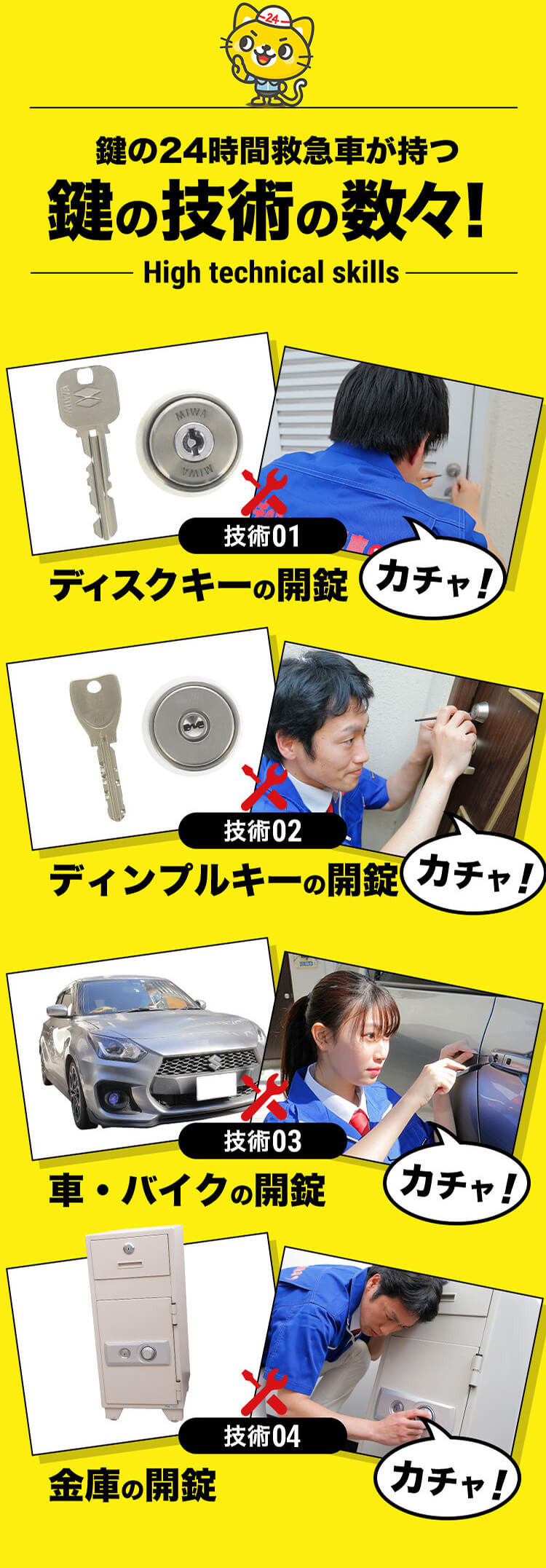 東京都足立区の「カギの出張24時間」では、お客様の安心と満足を最優先に考えています。北千住、竹ノ塚、西新井からのスピード対応、加えて24時間受付のマルチリンガルサポートを実施。清潔な服装と親切丁寧な接客はもちろん、訪問後には満足度調査を行い、サービス向上に努めています。作業前には明確な見積もりと詳細な説明を提供し、透明性と信頼をお約束。足立区で鍵の緊急事態に迅速かつ安心な対応を求めるなら、当店にお任せください。