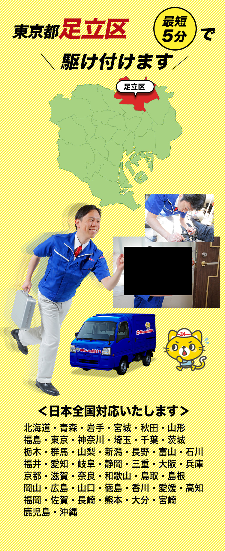 足立区で鍵のトラブル解決は、「カギの24時間救急車」足立区店にお任せください。当店のスタッフは毎週末に荒川河川敷でバーベキューを楽しみながらチームビルディングを行っており、その絆が仕事の迅速かつ丁寧な対応に生かされています。鍵開け、鍵交換、鍵修理、どんなトラブルも24時間体制で対応します。